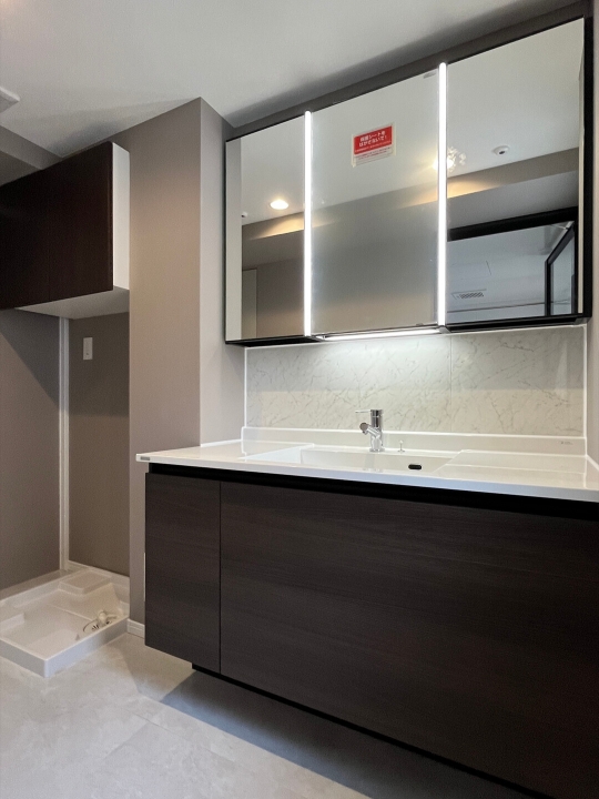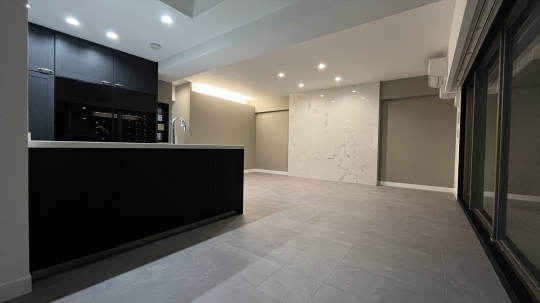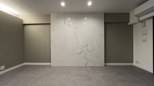 マンションフルリノベーション。ウォークスルークロゼットや壁掛TV背面を大判大理石調に。