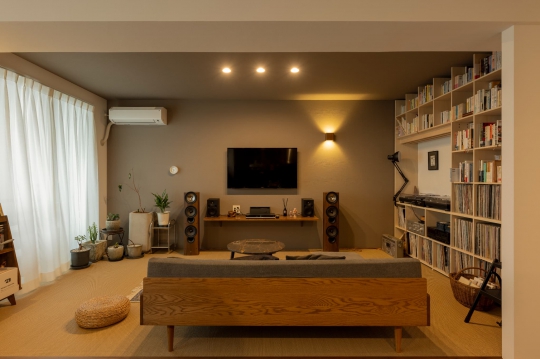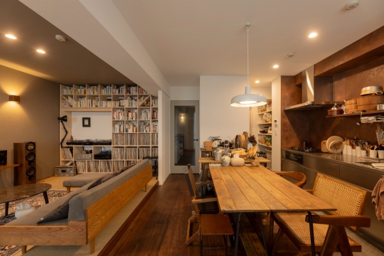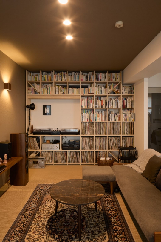 好きなものに囲まれて、こだわりのものたちと暮らす生活。好きな音楽や本、映画など趣味を存分に楽しめる住まいを目指し、築25年のマンションをリノベーション。