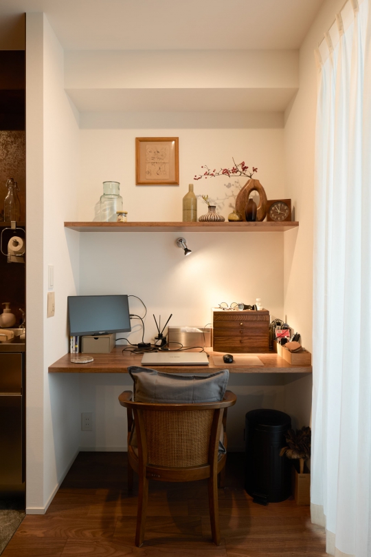 蒲郡市のマンションをリノベーションした今回の施工事例。 LDKの一角には、家族が集まってくつろげるように小上がりを造作しました。小上がりはその時々に合った自由な使い方もでき、空間にメリハリを与えてくれます。 さらにご夫婦それぞれの趣味の空間も設けており、リノベーションによって家で過ごす時間がこれまで以上に楽しくなる空間が完成しました。
