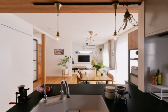 独立された娘様のご出産を機に昔ながらの細かく分かれたお部屋を繋げ、生活のしやすいLDKにされたいというご要望頂きました。ダイニングキッチンと家事室、和室を繋げ、キッチンはL型の対面キッチンです。