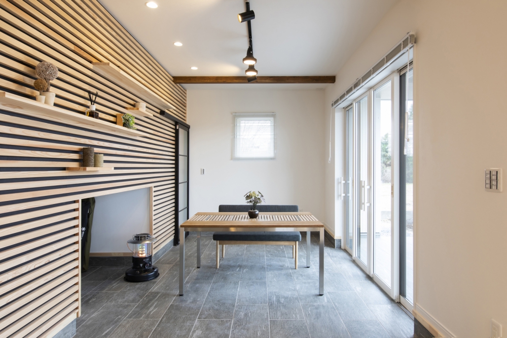 「家で野遊び」をテーマとし、玄関や庭とダイレクトに繋がる開放的で遊び心ある土間リビングには人が集まり自然志向のライフスタイルをゆったり満喫できます。
