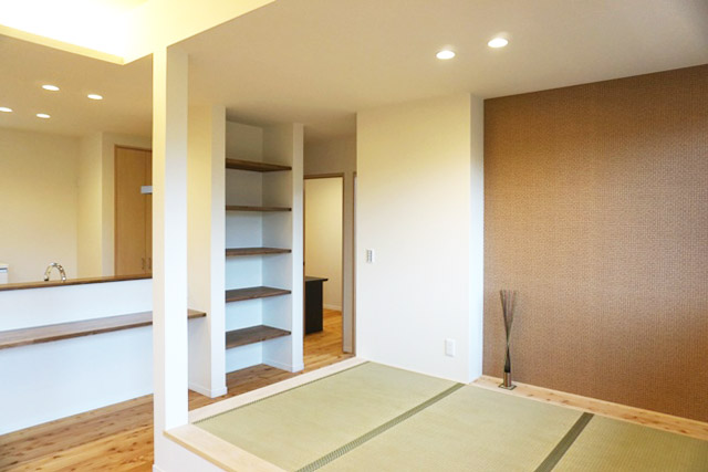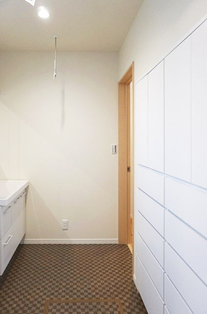 天井高さが2700㎜のLDKは、大きなコミュニケーションテーブルと寛ぎの畳コーナーに家族が自然と集まります。玄関の大容量の土間収納、洗面脱衣室に設えた壁面収納など生活を快適にする工夫もいっぱいです。