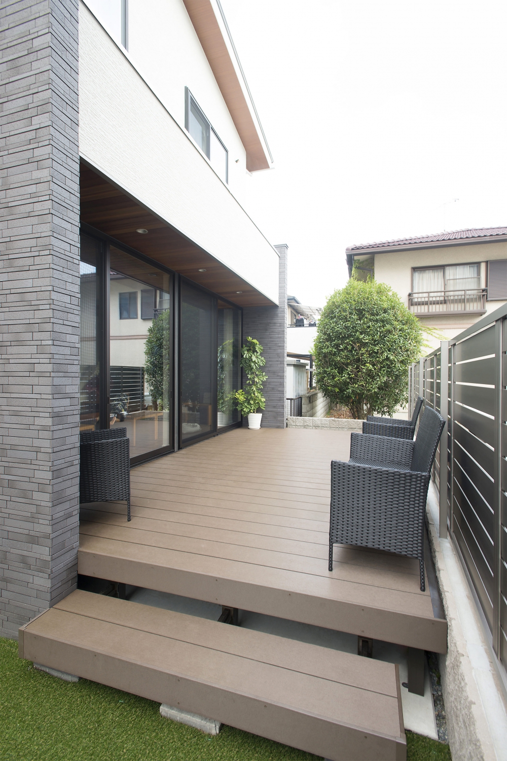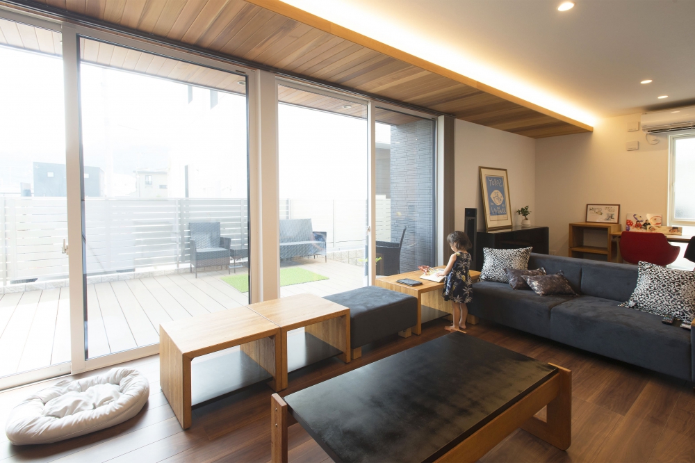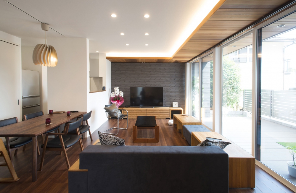 木目の天井が外中一体となり、大きな掃き出し窓を開けると大空間が誕生