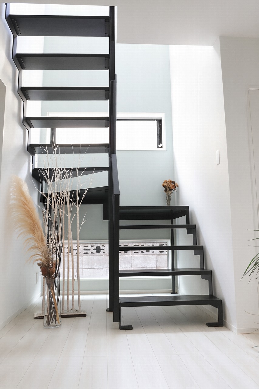 ブラックの鉄骨階段が空間を引き締め、デザイン性と開放感を両立した住まいです。