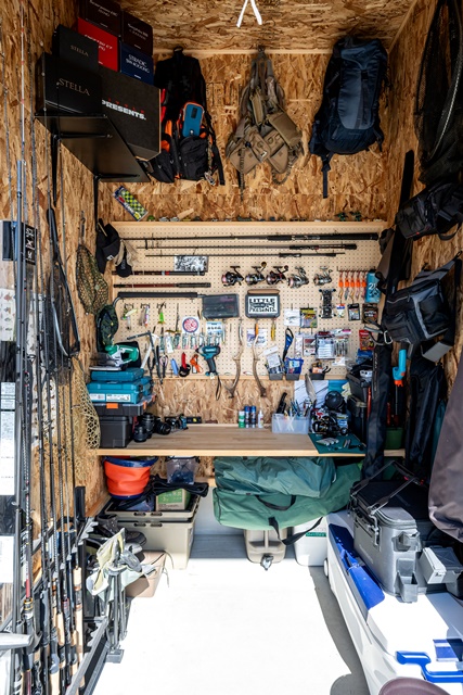 こだわりのアウトドアストッカー内部。壁と天井をOSB合板貼りにしたので、DIYで棚を増やしたり 釘を打ったりすることが可能。綺麗に並んでいる細かな美しいモノたちを眺めると、次の休日が楽しみでニヤニヤしてしまう。出入り口はシャッターなので大開口。道具の出し入れもスムーズだし、庭と同じ高さなので車と行ったり来たりする動線もGOOD