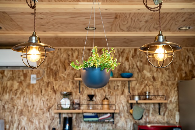 照明器具の一つであるライティングレールに、インテリアとして観葉植物をぶら下げるのが人気。引きで眺めて、トータルのバランスを考えてみよう。キッチン背面のOSB合板の壁は、好きな場所に棚を設置出来る優れもの。見た目だけでなく機能もGOOD!棚の位置は、ぶら下げるモノたちとのバランスを重視したい