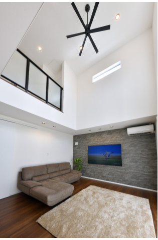 大きな吹き抜けがあり、明るく広々としたリビング。