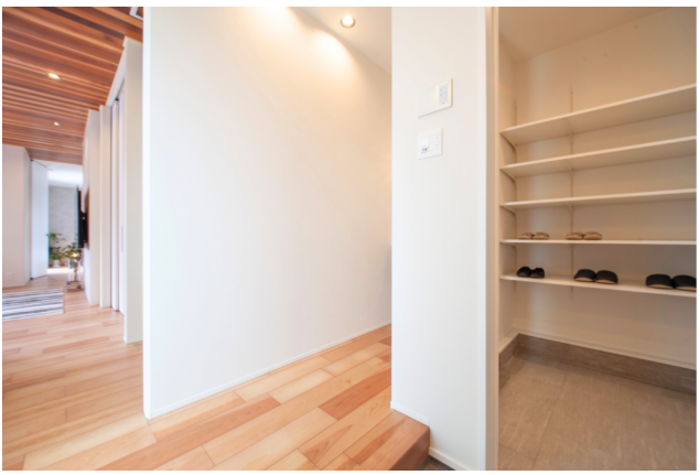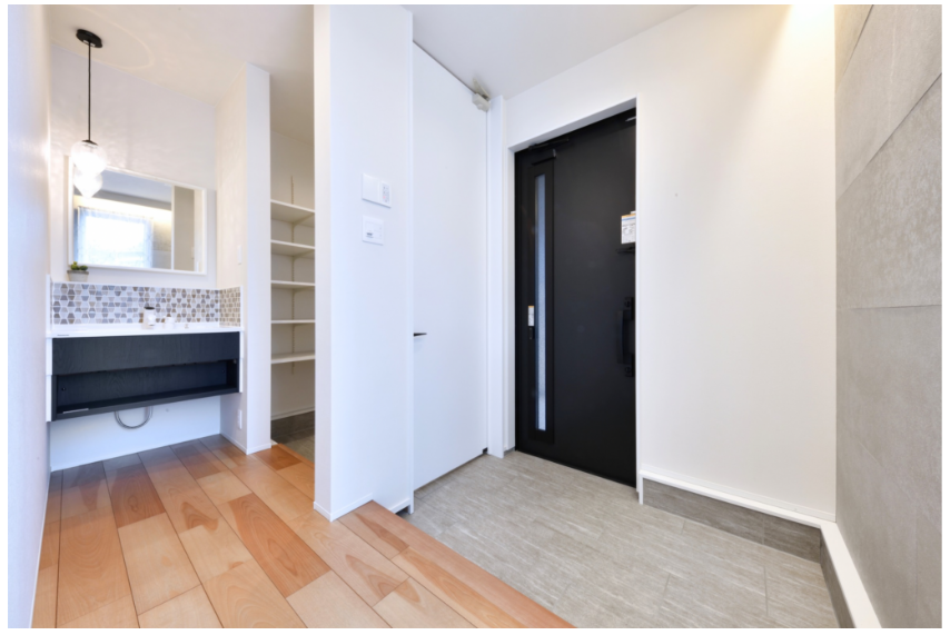 玄関を開けると・・・ 手洗い場とシューズクロークを備えた玄関は、帰宅後すぐに手を洗える安心感と遊び道具やベビーカーなどをスッキリ収納できる便利さを兼ね備えています。