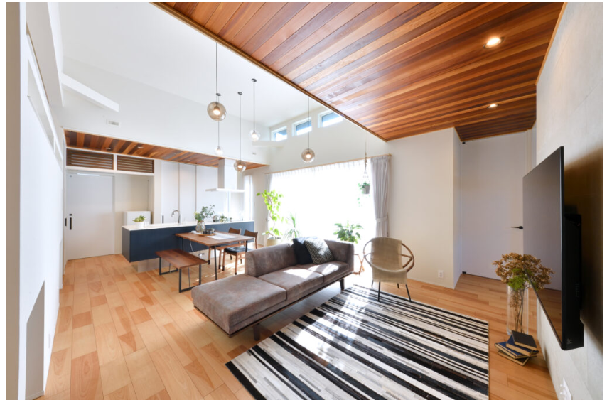 自然光が差し込むLDK。 吹き抜けがあるため明るく開放感のある雰囲気を演出。