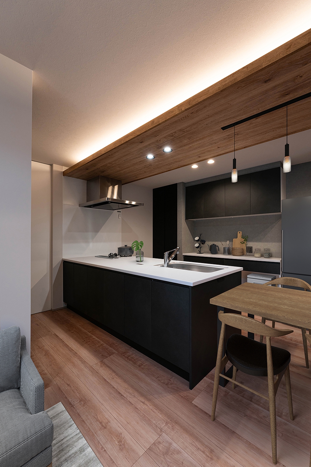 木目天井に沿った間接照明がキッチンスペースを柔らかく包み込み、落ち着いた雰囲気を。ダークトーンのキッチンキャビネットとナチュラルな木の質感が調和し、洗練された大人の空間を実現