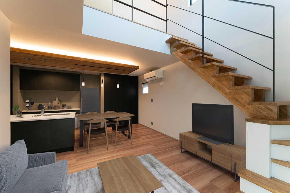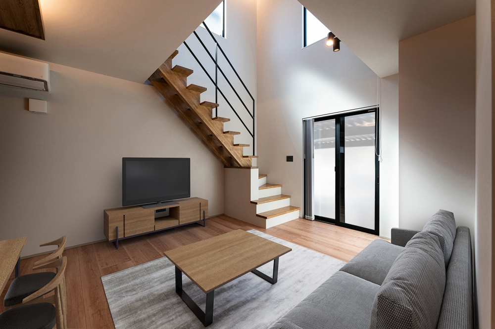 26坪コンパクトハウス 吹抜け+スケルトン階段+フルハイトドアで大空間に