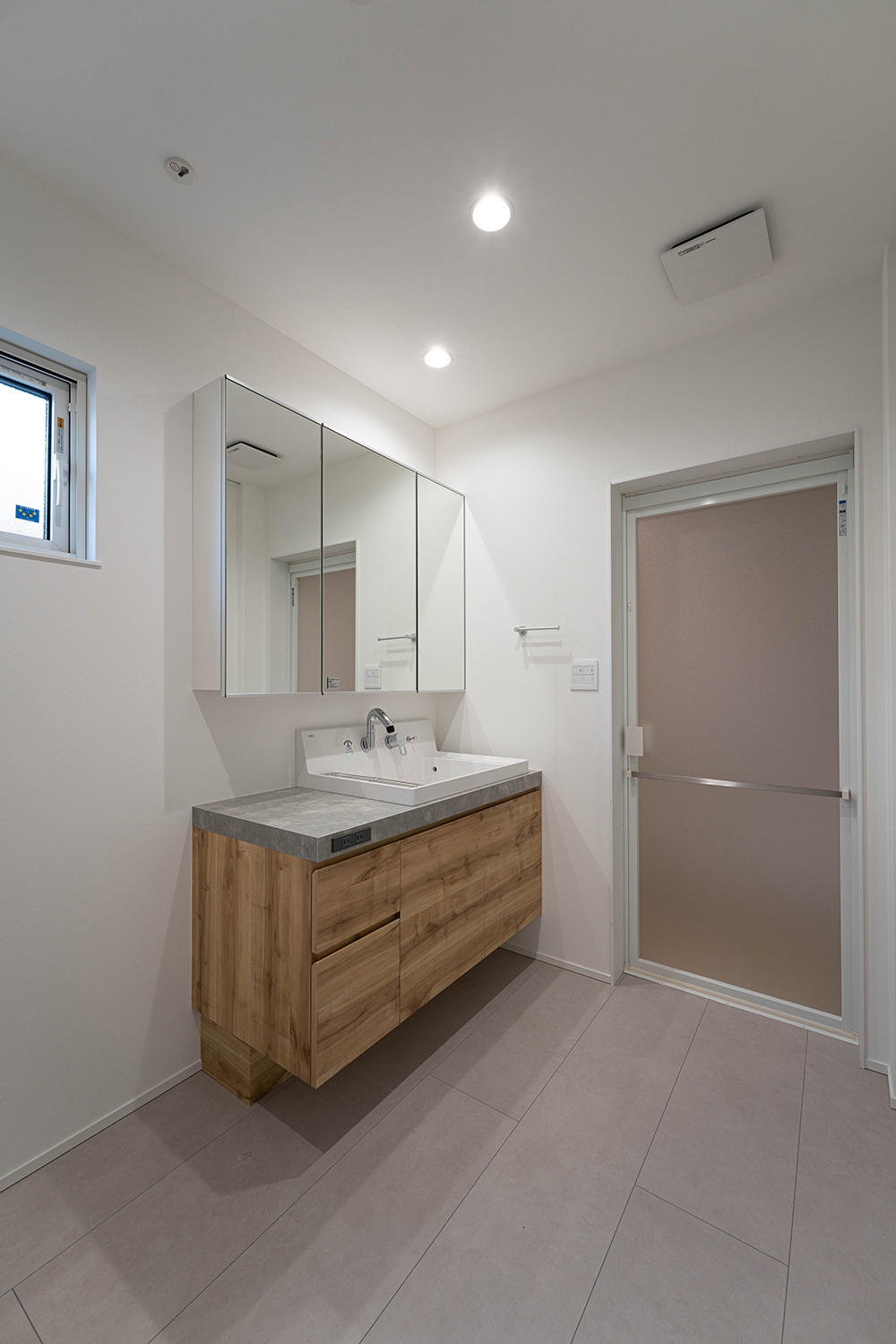 ナチュラルな木目のキャビネットとシンプルなデザインが特徴の洗面スペース