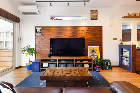 テレビボードの裏には木を貼りわけたアクセントウォールを配置