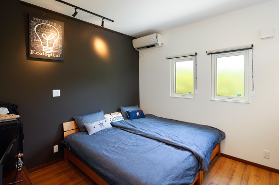 寝室の壁紙にダークな色味のアクセントウォールを設け、落ち着いた雰囲気に