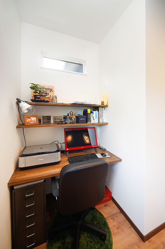 寝室の一角にはPCスペースを設けました。明かりとり窓を設けて暗くなりがちな場所も明るく