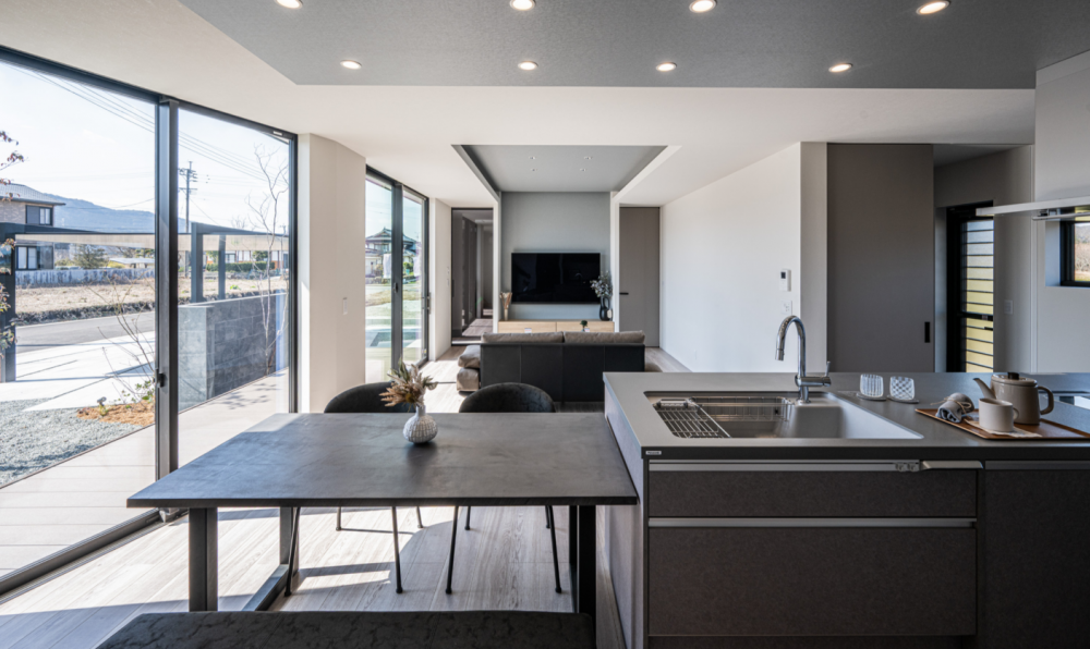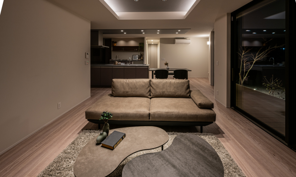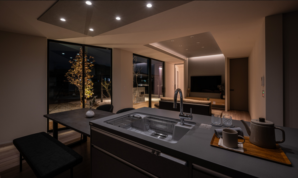 天井をふんわりと照らす間接照明が、落ち着きのある空間を演出。 ダイニングとリビングを一体にすることで、心地よい開放感と快適な動線を実現。 ほのかに灯る光と、窓の外に広がる自然の景色が、癒しのひとときをもたらす。 風と光が調和する、心地よい暮らしがここに。