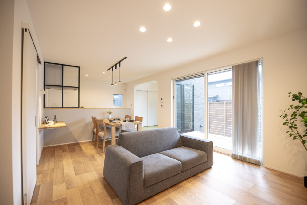 グレーが基調のスタイリッシュで洗練された外観です。リビングはI型にすることで、キッチンで家事をしていてもLDK全体を見渡せる空間に。垂れ壁によってLDKと空間を分けることでおこもり感のあるタタミコーナーも。造作洗面は木調を採用し統一感のあるデザインに。広くとった主寝室には、扉を付けずに空間を分ける垂れ壁の大容量WICも。ウッドフェンス付きのお庭空間と広々としたウッドデッキプライベートな時間を。