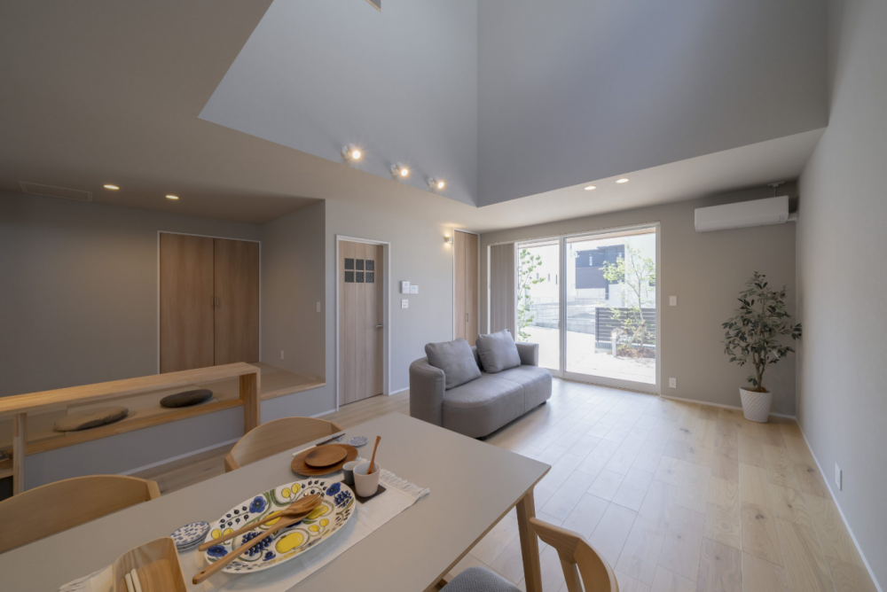 黒基調に天然木の温かみがアクセントな外観。吹き抜けリビングは光を取り込む心地よい空間に。タタミコーナーの造作カウンターでシーンに合わせた使い方を。開口の広い玄関ホールはゆったりとした開放感で家族が来客を温かく迎える余裕のある空間設計に。ウッドデッキ付きの庭は、リビングの延長のような開放的な屋外空間に。木調を取り入れた温かみのある造作洗面は大人2人が並ぶことが出来る広々サイズに。