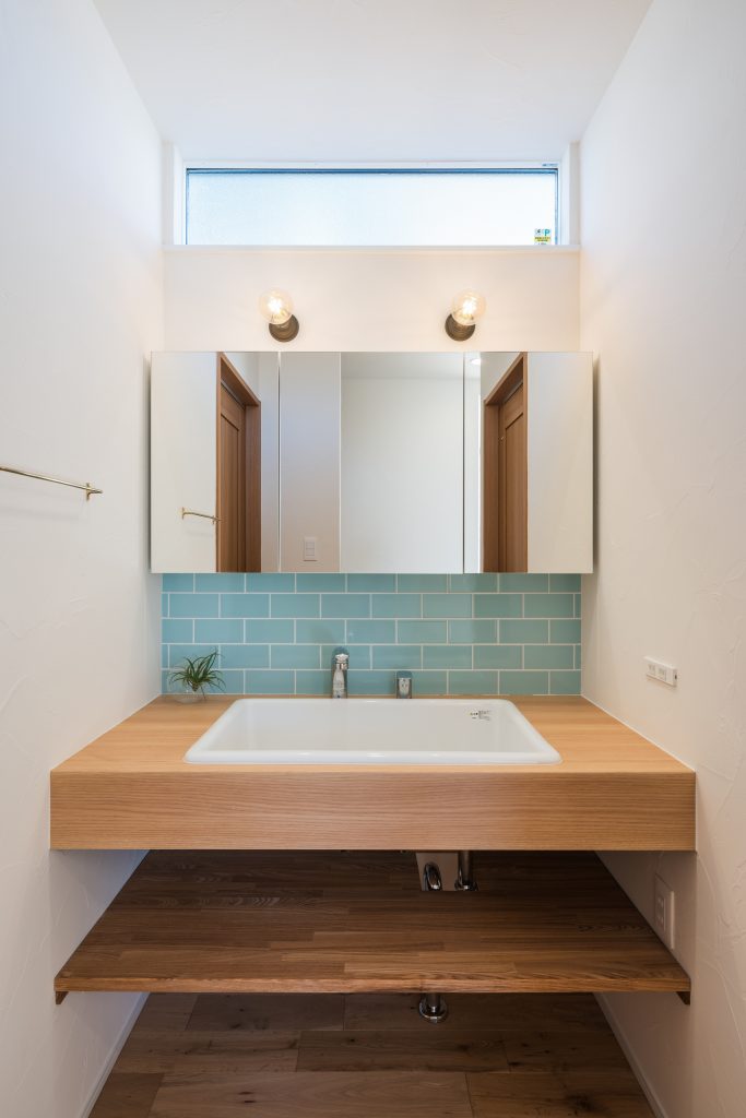 脱衣室兼用の物干しスペース。アイロンがけや収納のできる造作カウンターも。