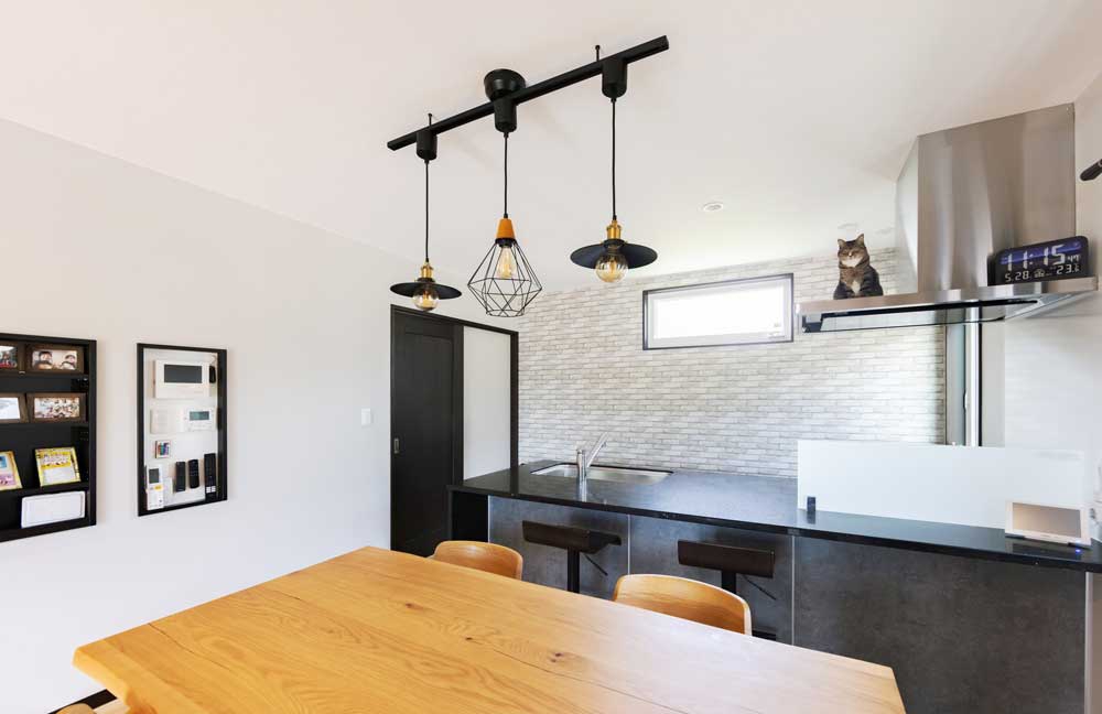 外観やキッチン、バスタブまで黒で統一され、スタイリッシュな印象の平屋。 カップボードや冷蔵庫、キッチン家具をパントリーに納め、隠す収納にするなど、できる限り生活感をなくした家に仕上がりました。 子ども部屋は子どもたちが小さいうちは1部屋で広々と、将来は子どもたちがそれぞれの部屋が持てるように2部屋に仕切れる造りにするなど、のびのび遊べるように細部にもこだわった造りになっています。