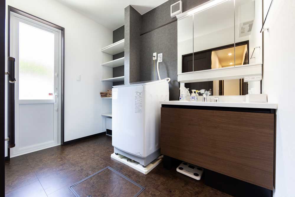 三面鏡付きのおしゃれな洗面化粧台は標準装備。小物やバスタオルなどを入れられるウォールシェルフも設置