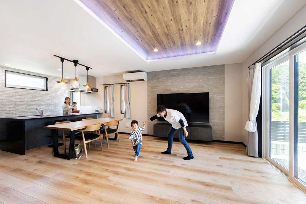 LDKは20帖を超える広々とした大空間。壁材に調湿効果のあるエコカラットや折り上げ天井でアクセントを効かせたおしゃれな空間に