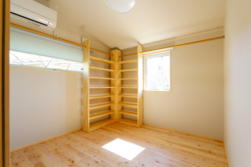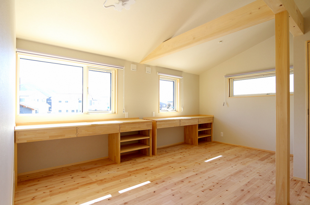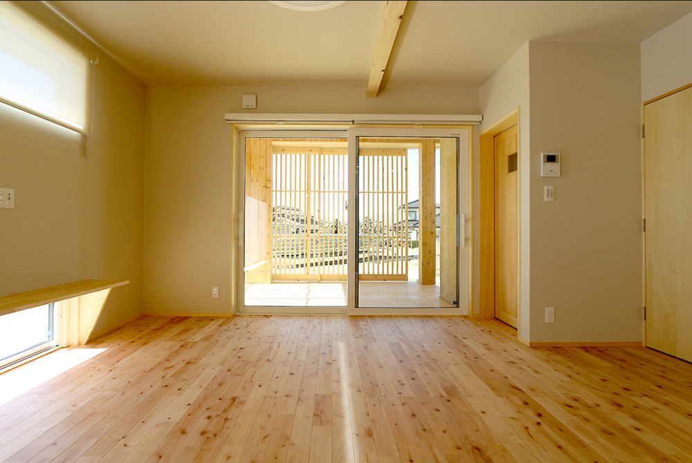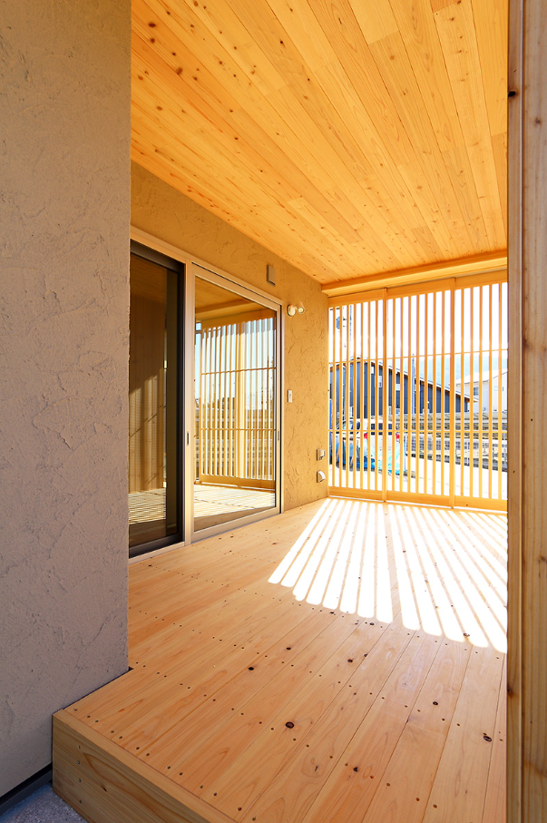 板張りにした道路側の壁は、ウッドデッキとの一体感を持たせながら、木の温もりを感じさせます。開閉自由で外光をやわらかく取り込む、デッキのオリジナル格子戸。プライバシーを守り、心地よい空間を生み出します。また、リビングとつなげば空間がより広がり、家族の楽しみ方も広がります。2階の現状は自由に使える開放的なホールと個室を設け、将来的にはホールを2部屋に間仕切り可能です。