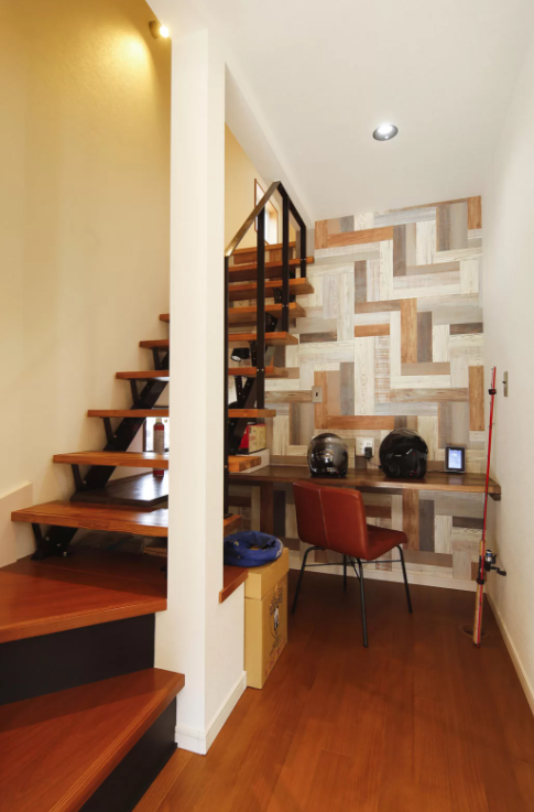 ナチュラルな雰囲気の落ち着く室内。オープンなお家にしたいというお施主様のご希望で、扉や仕切りを極力少なくし、開放感のある空間に仕上げました。カフェスペースをイメージしたキッチンカウンターが素敵です。階段下のスペースも余すところなく活用し、多趣味なご夫婦の為のちょうど良いおこもり感の趣味スペースに。