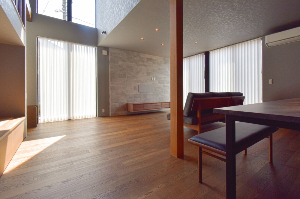 シックな配色と無垢の木が調和する、開放的な吹き抜けリビングのお家
