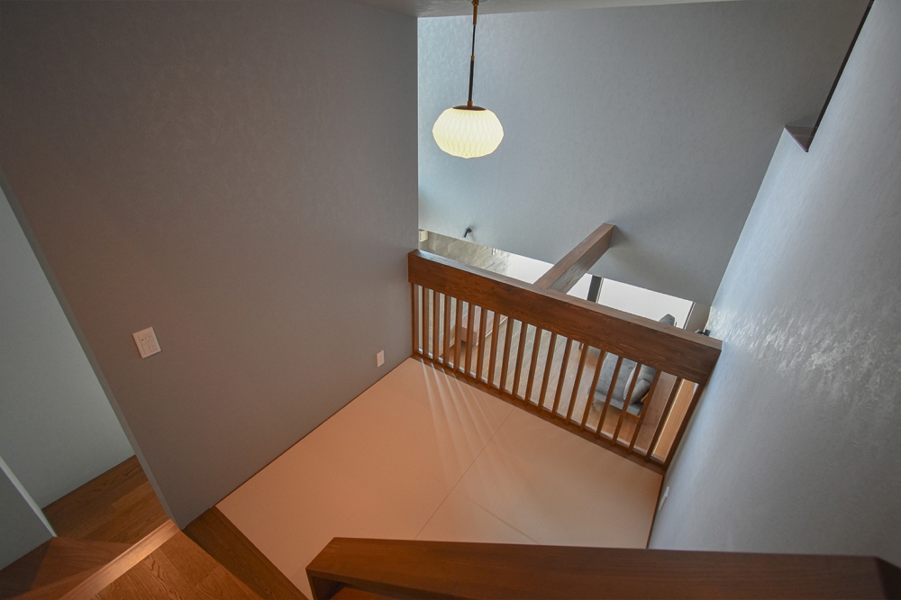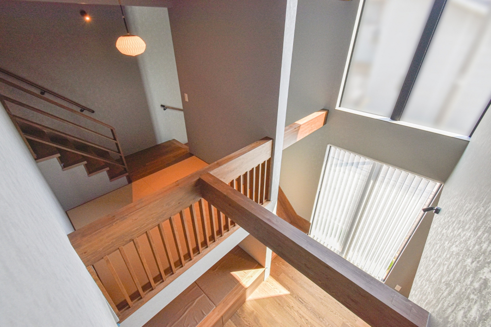 吹抜けの大きな窓から、1階の隅々までしっかり自然光が届きます。視線が抜けるオープンな木製の手すりを採用することで、空間がより広く感じられる工夫も。1階にいる家族の気配を感じやすく、家全体が明るくつながる設計です。
