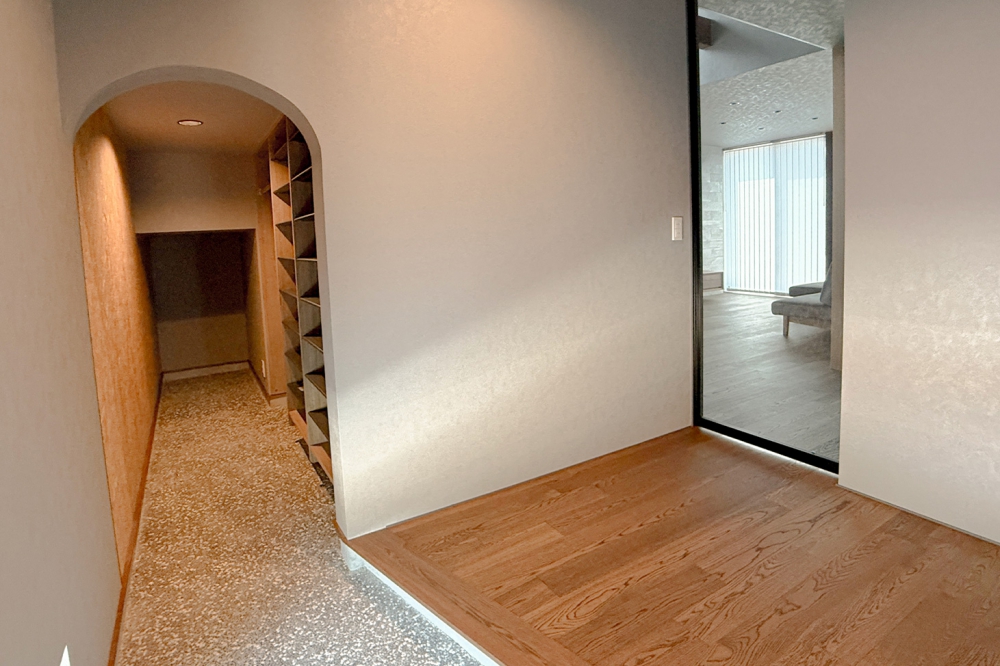 玄関を入ってすぐ横には、靴やアウトドア用品をたっぷりしまえる収納スペースを完備。入り口を丸いアーチ型にすることで柔らかい印象に。奥のリビングへと続く扉をガラス戸にすることで、明るさを確保しています。
