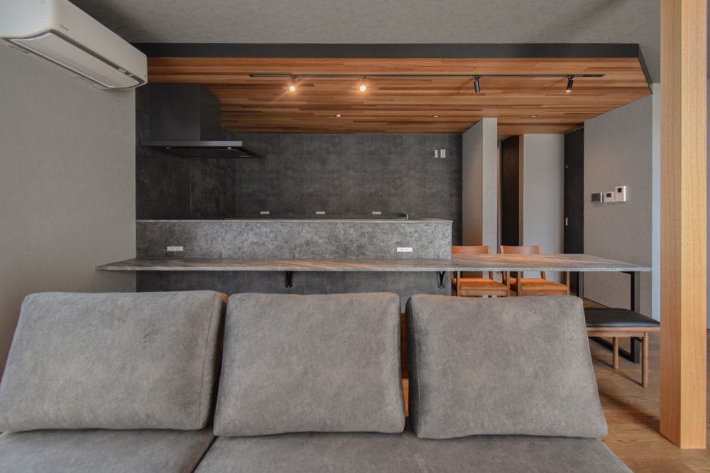 キッチンとダイニングテーブルを横一直線に並べることで、作ったご飯をサッと出せて、お皿を下げるのも劇的にラクになります。天井を木目にすることで、空間にメリハリを生んでいます。