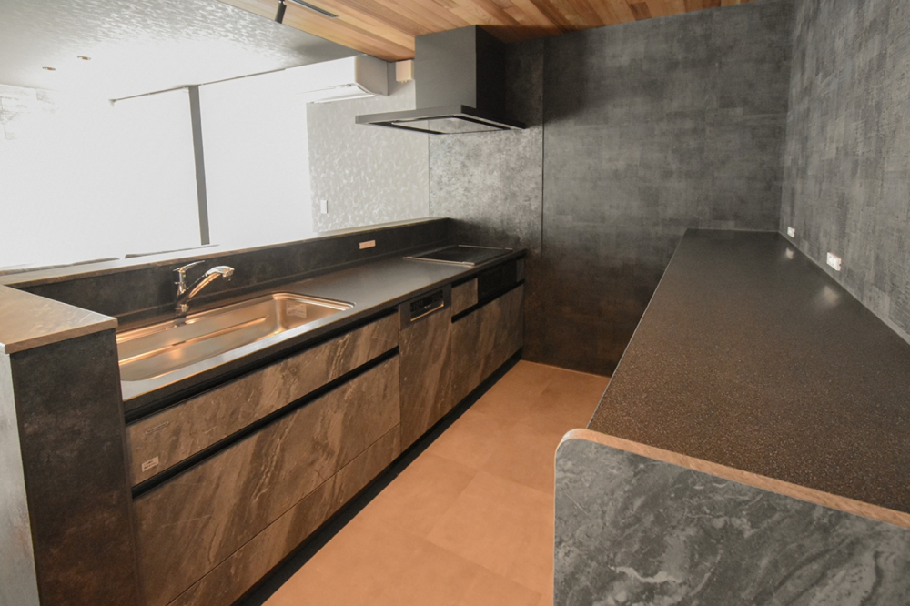 コンクリートのような柄で統一された、カフェやレストランのようにおしゃれなキッチンスペース。手元が広く使えて、毎日のお料理のモチベーションも上がりそうな洗練されたデザインです。