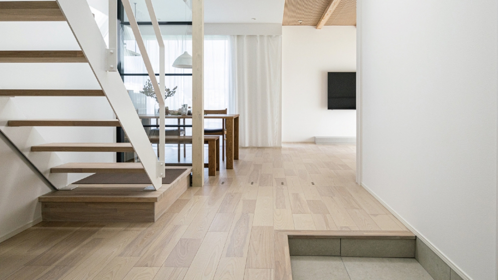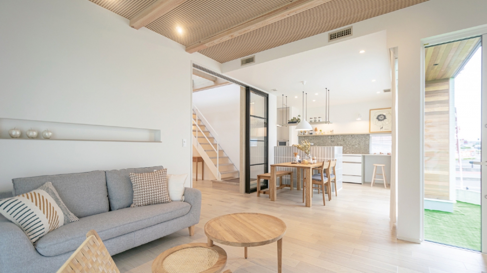 段差のある天井がリズムを生み出すLDK。リビング天井には木材をあしらい、自然素材の温もりと高級感を両立。開放的でナチュラルな空間は、光や風の通り道を意識した設計で、家族のくつろぎの時間をより豊かにしてくれます。