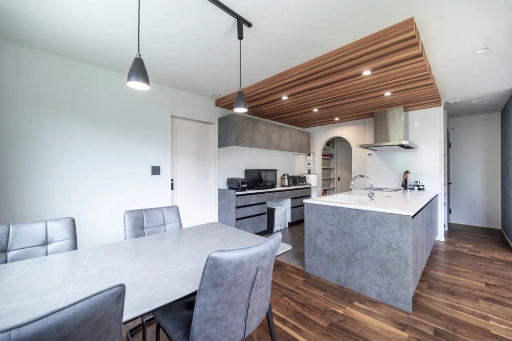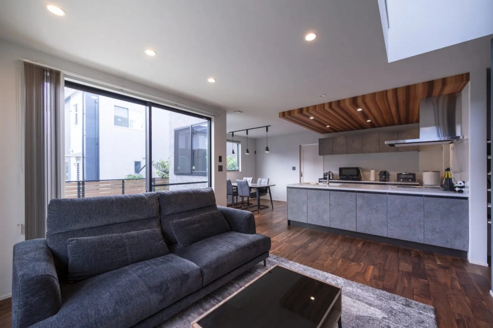 グレーを基調とした室内に、ブラックウォルナットの無垢床を取り入れたLDK。深みのある色味が空間全体を引き締め、落ち着いた雰囲気を演出しています。