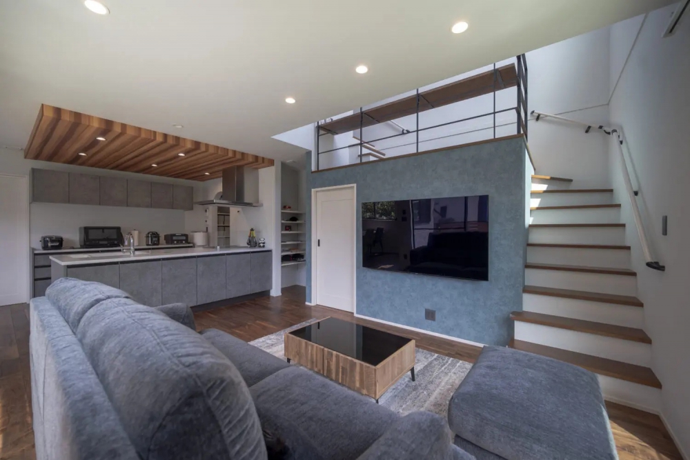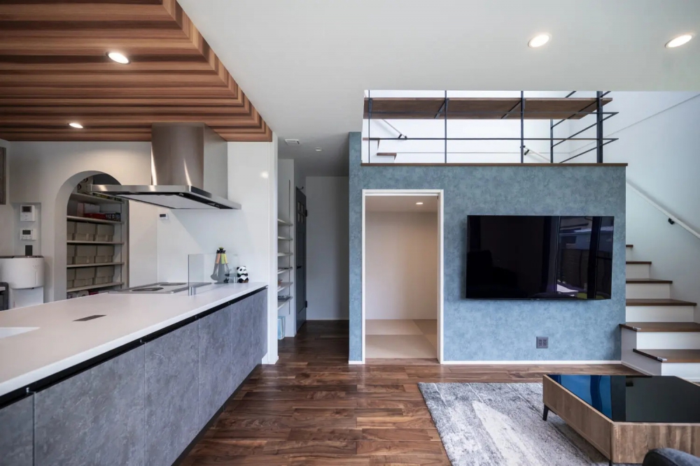 ブルーグレーのアクセントクロスが目を引くスキップフロア。高さに変化をつけることで、LDKとのつながりを感じながらも自分時間を楽しめる場所に。