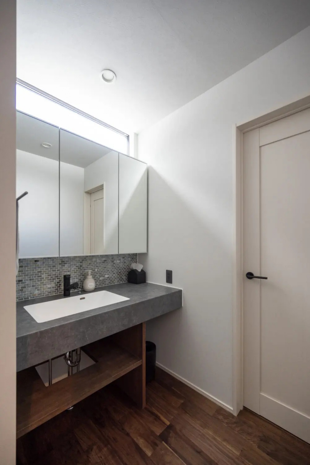表情豊かなガラスタイル(ニューヨーカーグラス/名古屋モザイク)をアクセントに取り入れた、ホテルライクな洗面室。高窓(ハイサイドライト)を設けることで、プライバシーを守りつつ採光を確保しています。