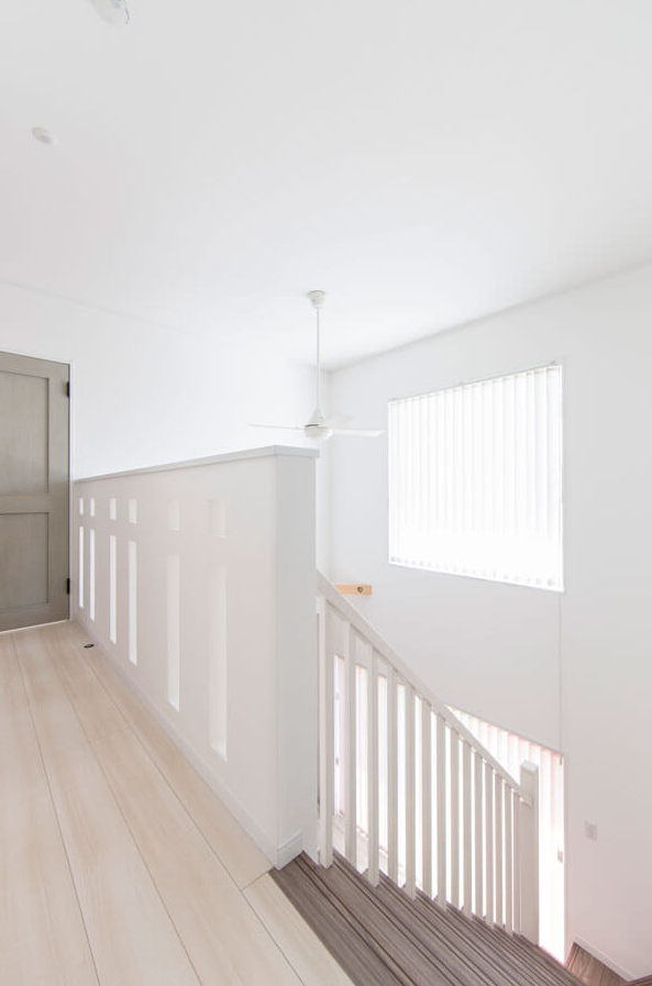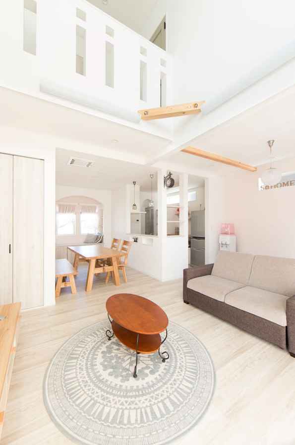 吹き抜けから注ぐ陽光とやさしい色彩に包まれた家