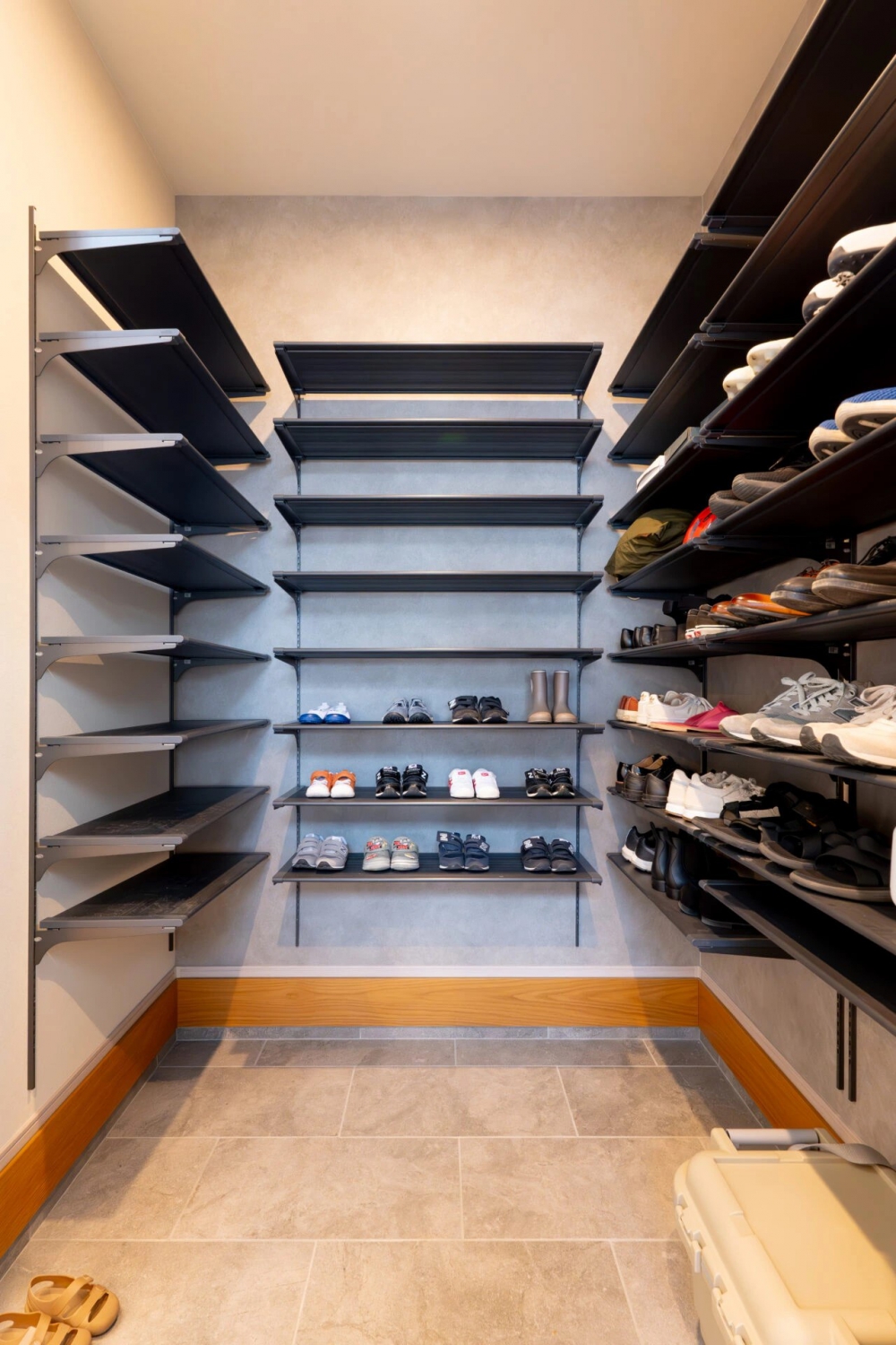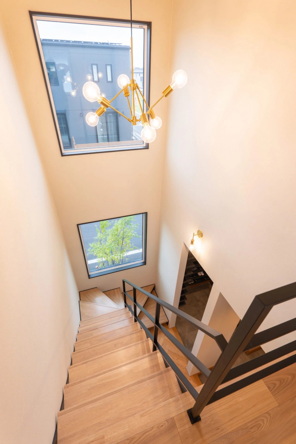 ストリップ階段とアイアン手すりが吹き抜けをより一層際立たせます。