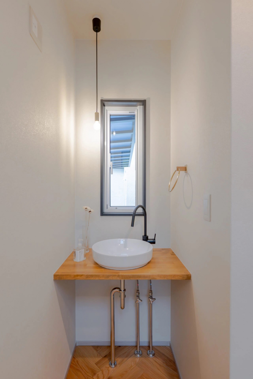 真鍮の照明やヘリンボーンの床など、シンプルでスタイリッシュな家と合うアイテムをご夫婦でひとつひとつ選び抜かれました。