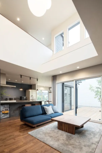 大きな吹き抜けと窓から光が降り注ぐ開放的なLDKはウッドデッキとフラットにつなげることで外の緑を感じられる。