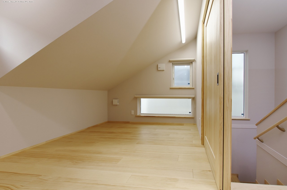 勾配天井のあるロフトはMさんのアトリエ空間として使用。しっかりとした広さがあるので、活用方法は自由自在