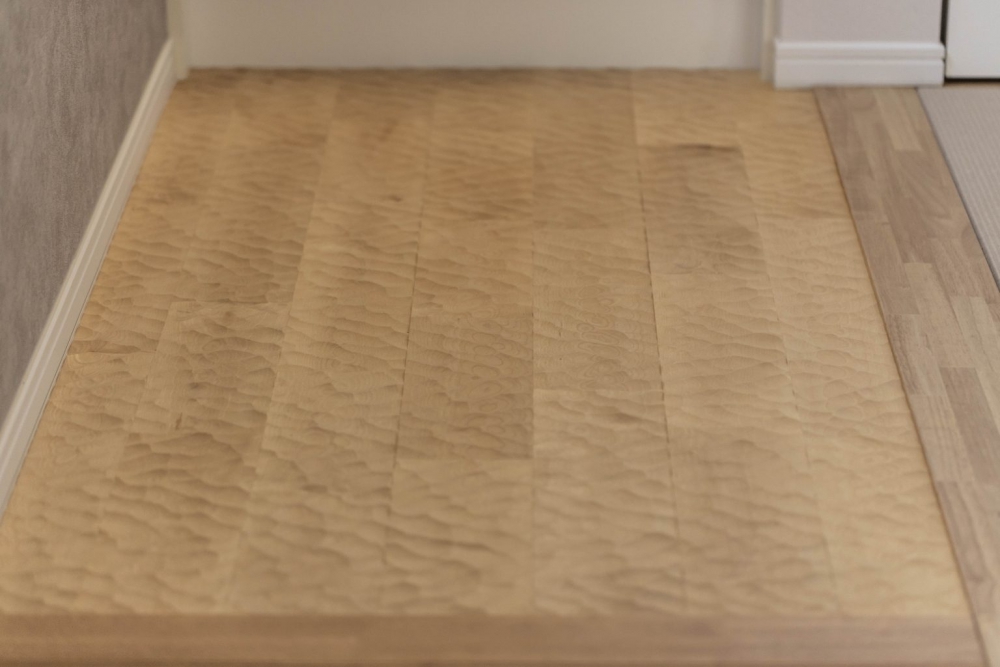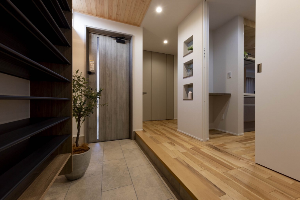 【玄関】天井には桧無垢板貼り ニッチが三つ アクセントになってます
