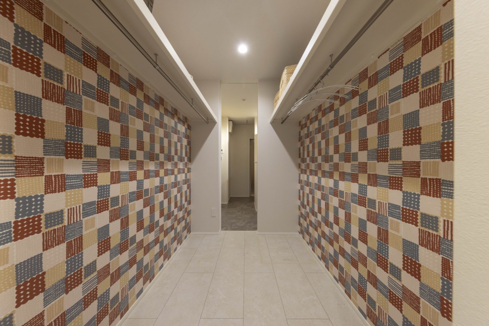 ユーティリティの横に備えられたウォークインクローゼット 奥様の選ばれたクロス かわいい