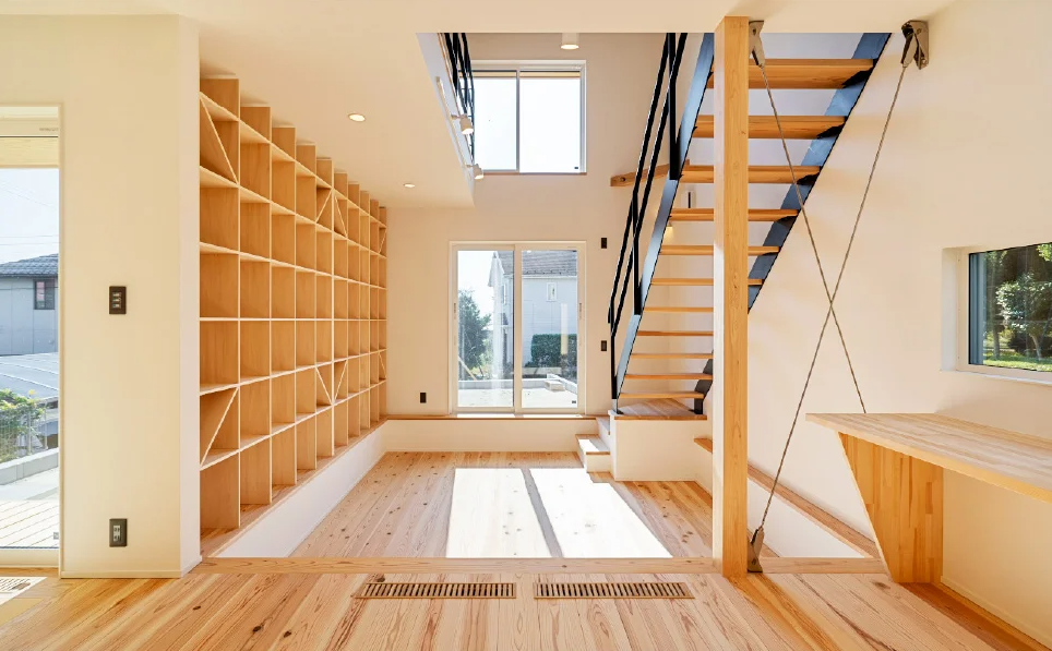 梁を見せる天井や土間収納など、様々な提案やアドバイスがとても参考になりました。リビングの本棚やベンチ、パソコンデスクや棚などオーダーした造り付けの家具が室内のトーンを揃え、統一感のある空間を実現することができました。