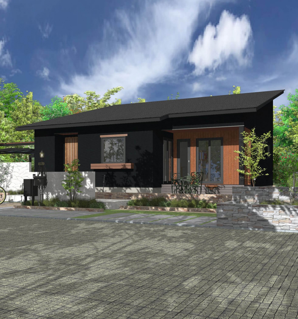 ブラックのサイディングをベースに木目調のサイディングでアクセント。アイアンや木材を使った家具が似合う重厚感と、やさしい木の温もりを感じられます。