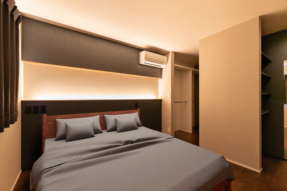 シックで落ち着いた雰囲気が漂う寝室。天井の間接照明が、部屋全体に柔らかな光をもたらし、リラックスできる空間に