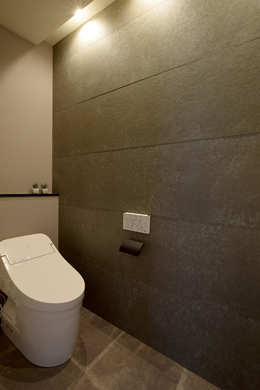 ダーク系の落ち着いたトイレは息子さんの案。ダークグレーのフロアタイルを壁に使用している