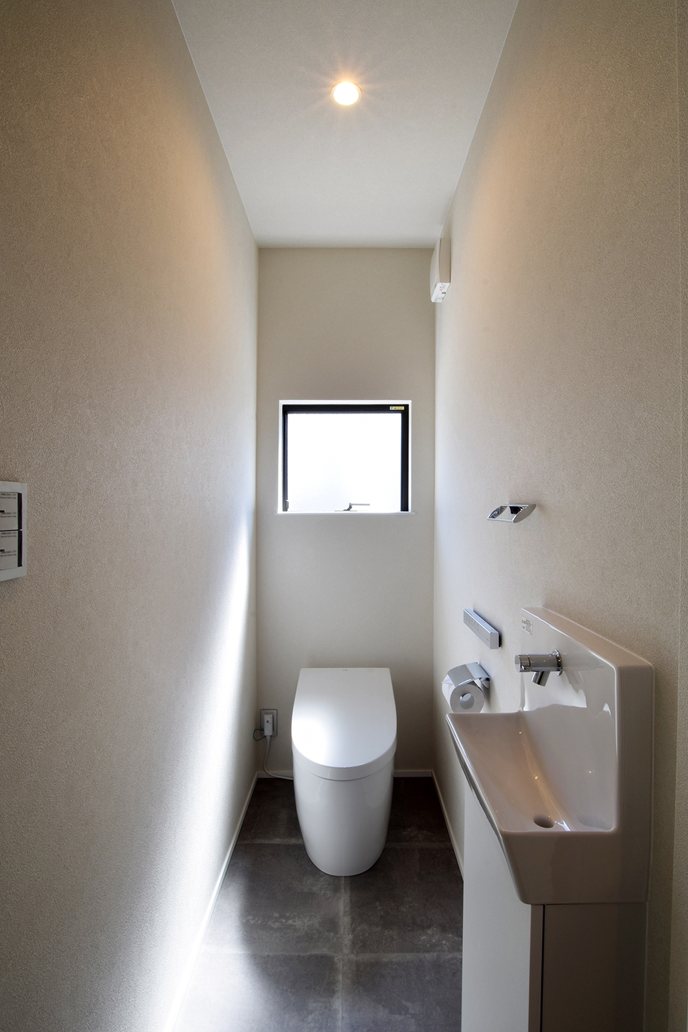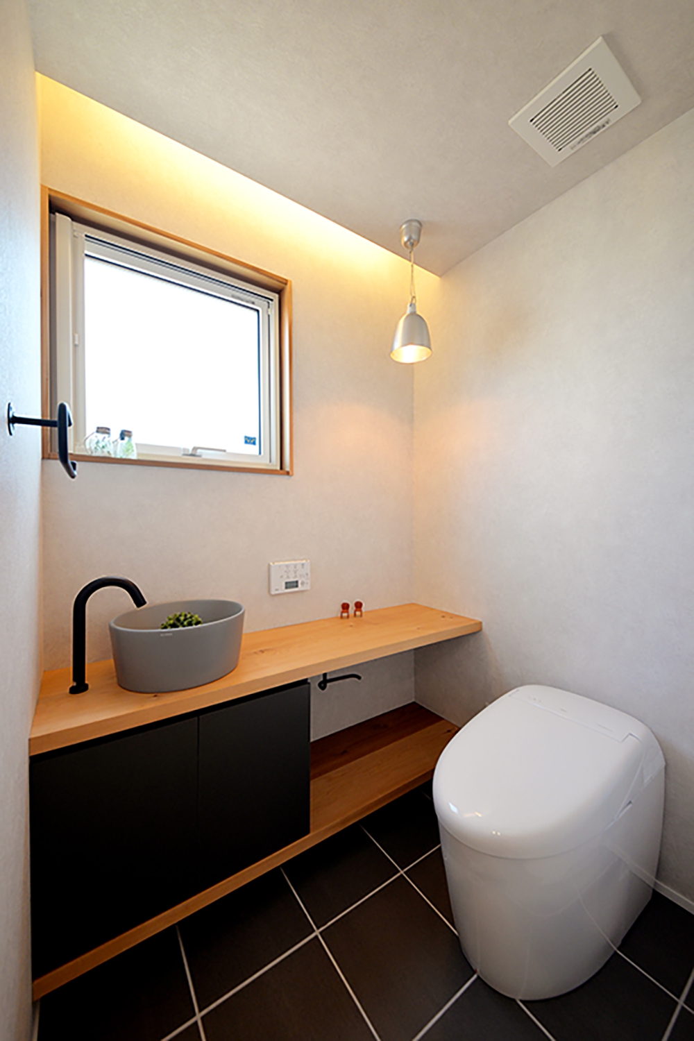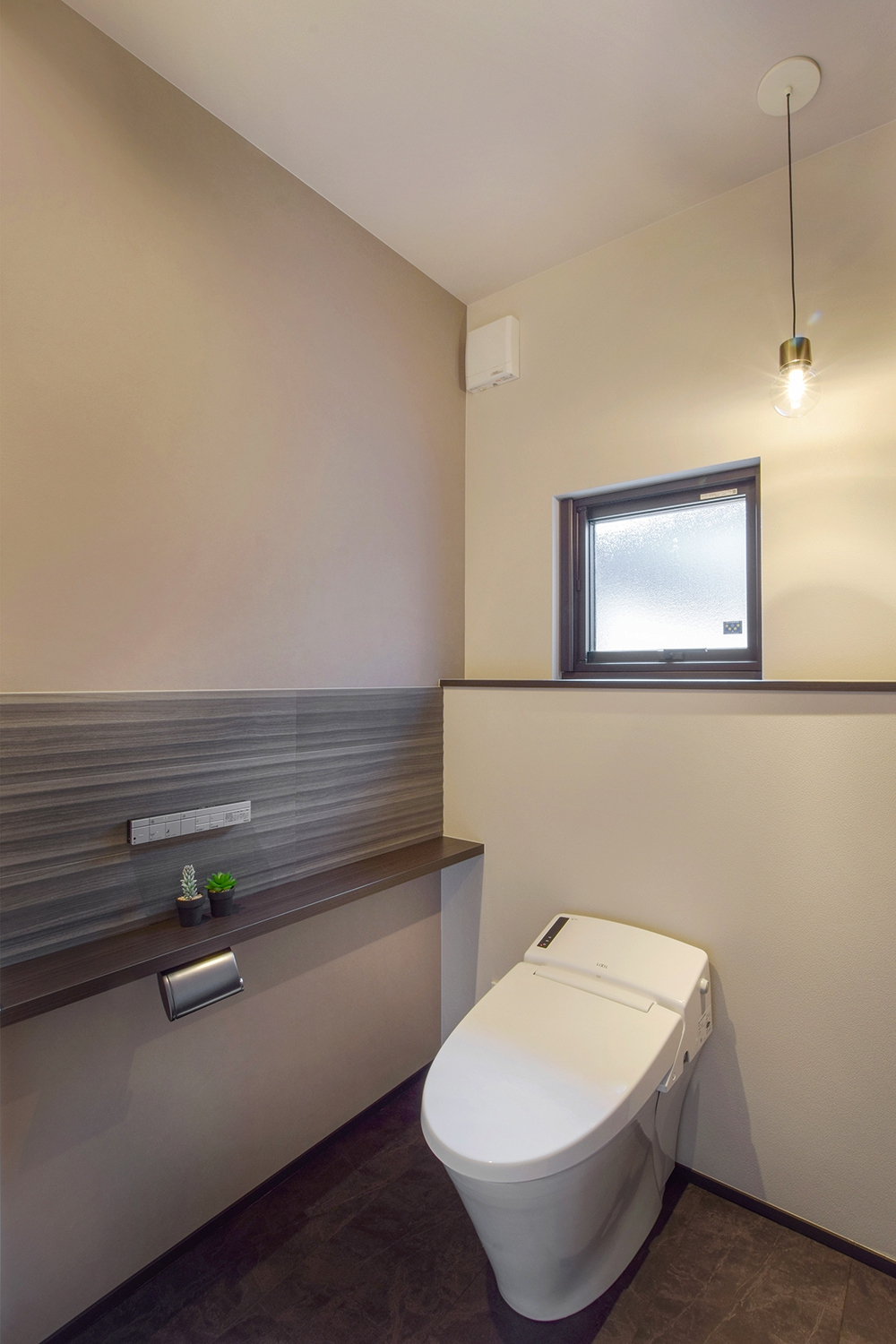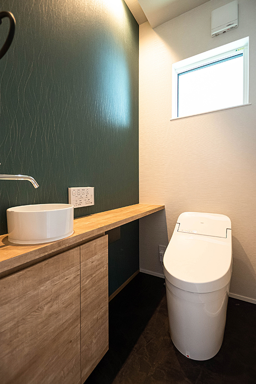 1階トイレはエコカラットを貼り消臭調湿効果。グレーと木目の組み合わせで落ち着いた空間に