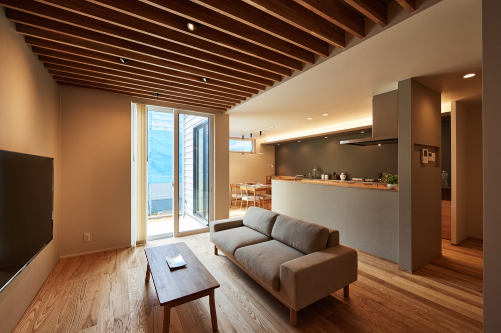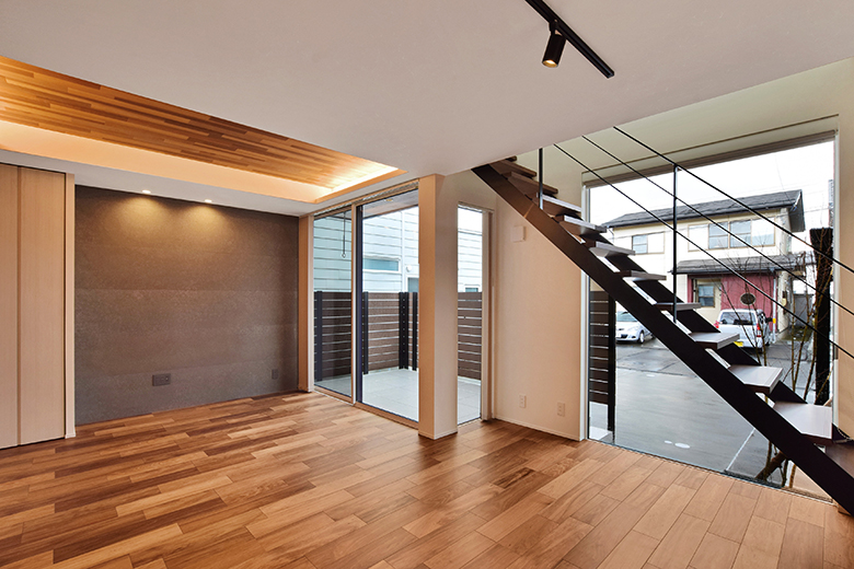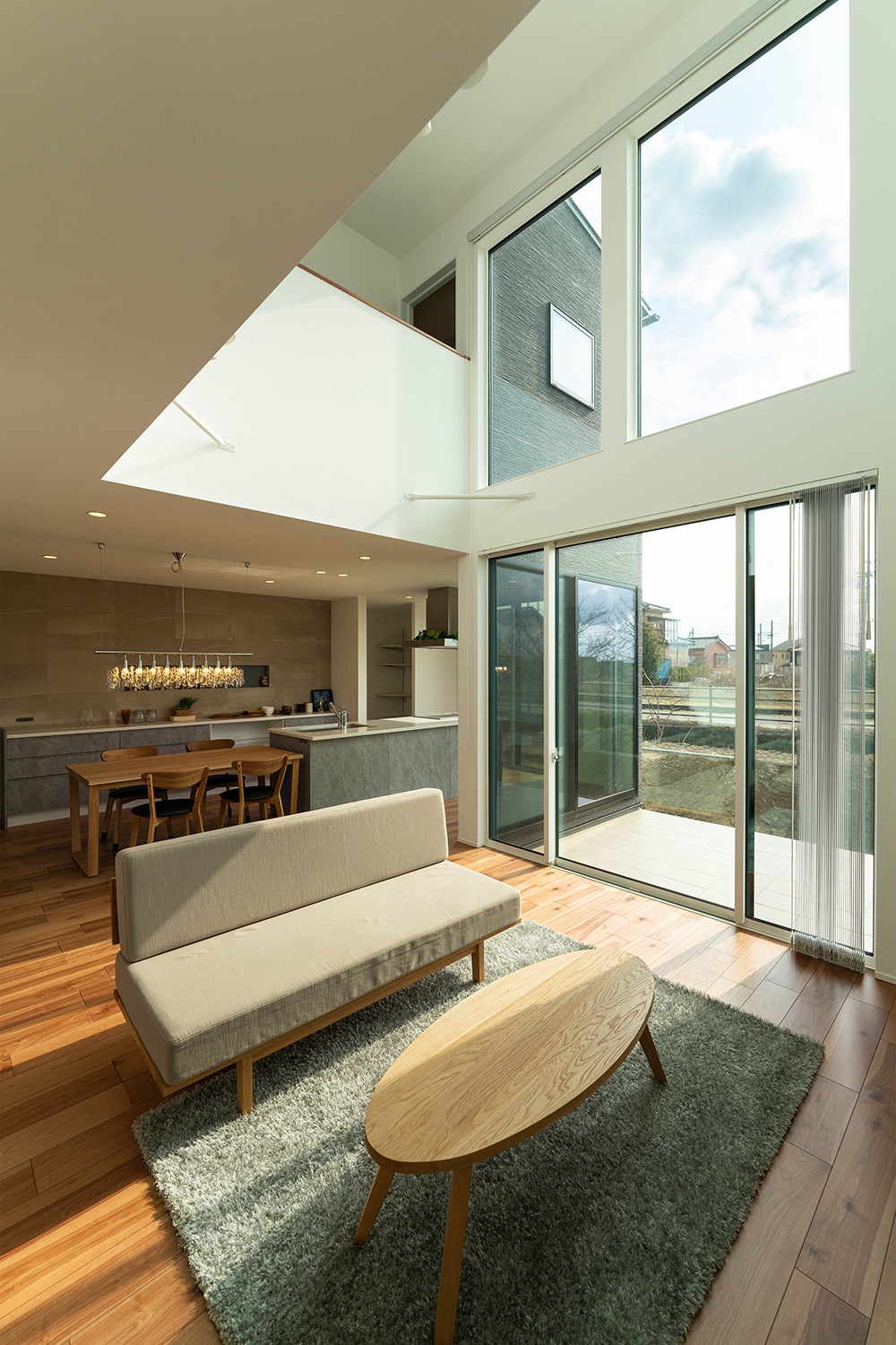 通り沿いには外からの視線に配慮して窓を最小限に抑えてどこか閉鎖された印象を与えるが、LDKは吹き抜けや大開口からの光に溢れ明るく、無垢材の温かみと相まって居心地の良さに包まれている。